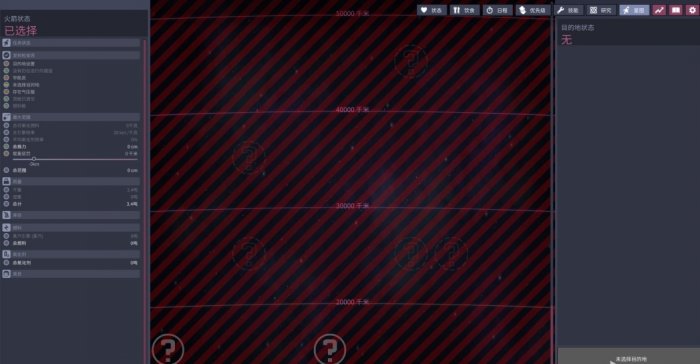 按Z打开星图,从左边选择你要发射的火箭,然后点击星图上你要去的星球就可以了。星图里标红的区域代表火箭飞不了,要么是燃料不足,要么是火箭太重了,要么是引擎太烂,这里因为我还没有灌蒸汽,所有都飞不了,从左边也能看出,总推力0。