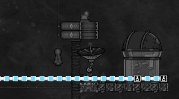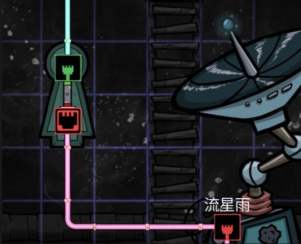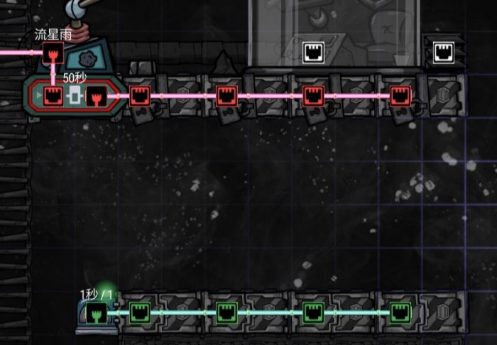 最后是望远镜部分,当地堡门打开后我们希望浮土不要与望远镜换热,所以要继续保持望远镜下方的机械气闸打开一小段时间。通过缓冲门,让流星雨结束后继续输出50秒绿色信号保持气闸开启,而地堡门打开需要40秒,有10秒的缓冲时间。当浮土穿过望远镜掉落到下方机械气闸,同样会被气闸吃掉。