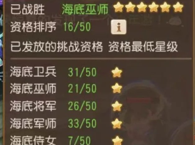 以我们队伍为例,海底巫师有21队打了,资格排序是16/50