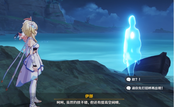 触发任务后钓鱼,钓到护身符收杆,把护身符交还给伊部,对话结束后开启宝箱即可完成任务。