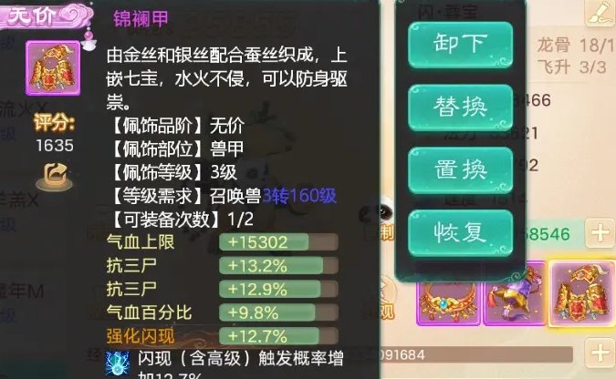 配饰:兽铃、环以抗伤害法术为主,兽甲增加气血为主,其他属性随意,强化隐身(最优)、闪现其次。