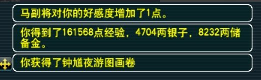 最后和各位少侠说说种族任务的奖励吧,小美在开着双倍和精修,没有4门奖励的情况下,完成第10环种族任务获得了160000经验和5000两银子8000两储备金(储备金模式)。