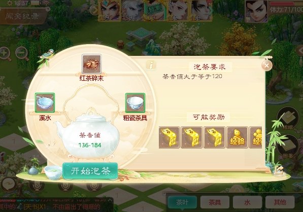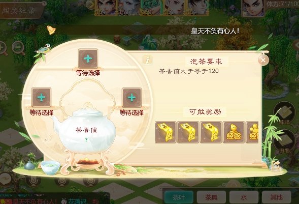 泡茶总共5层,每层的茶香值够了可直接进入下一层。