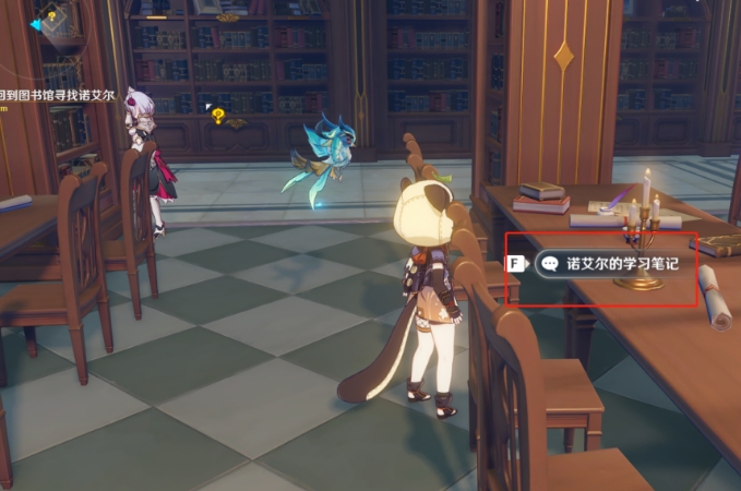 回到图书馆后先不要去和诺艾尔对话,先去查看旁边桌子上诺艾尔的笔记