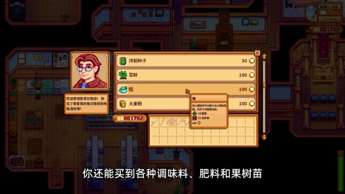 杂货店营业时间是上午9点到下午5点,我们平时买东西的时候都是直接和皮埃尔互动,不需要去货架上拿东西。一般来说,种子只能买当季的,除非你把皮埃尔丢失的存货单还给了皮埃尔。除了种子以外,你还能买到各种调味料、肥料和果树苗,这些货物是全年出售的,只要皮埃尔在柜台前站着就能买。接下来说一下大家平时玩游戏时可能没有注意到的细节。