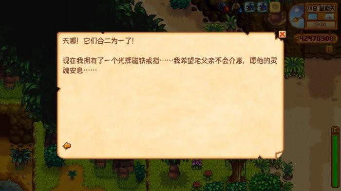 这张是最后的一张日记残页,告诉我们戒指可以合成,方法是使用火山顶层的锻造台,把自己想合成的两枚戒指放进去,消耗20个火山晶石就可以合成了,合成后的戒指名字会变成组合戒指,保留两枚戒指的属性,通俗来讲就相当于可以戴四枚戒指了,两个相同的戒指不能合成,因为这一块涉及的戒指很多,每枚戒指的功能也不同,我这里如果展开讲就很长了,各位可以按照自己的需求来进行合成,下面我就推荐我个人使用的万能搭配