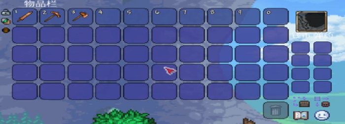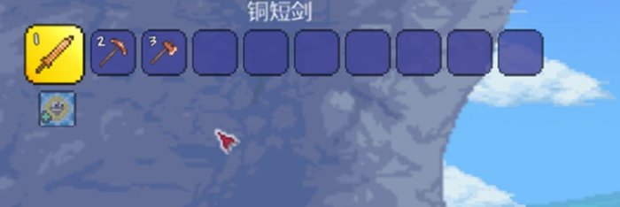左上角是快捷物品栏,把物品放在背包的第一行,就可以通过键盘上1234567890来进行快速切换,如:目前按1是铜短剑,按2是铜稿子;