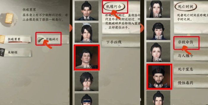 回到内宅与代骁对话,先提交证物【花瓶碎片】,再提交孟铁证据【机缘巧合】,然后提交老马证据【非致命伤】。