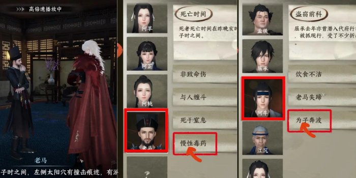 返回外宅,再次与江尘对话,先提交老马证据【慢性毒药】,再提交阿牛证据【为子奔波】。