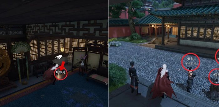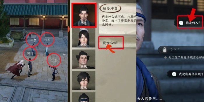 来到外宅区域,与阿牛(一条线索[8])、阿宝(一条线索[9])、阿苹(三条线索[10][11][12])、阿芷(两条线索[13][14])对话解锁线索。