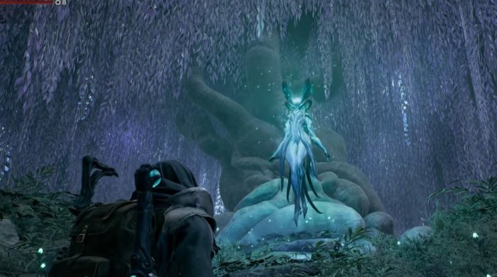 位于斑驳林地的精灵姐姐,地图会有一颗很明显的蓝紫色大树,过去对话回答问题即可,可以获得树皮或者血流特性,对话前副本刷过卡尤拉的休憩,获得库埃拉之泪可在此处换取一把副武器弓弩哀痛。