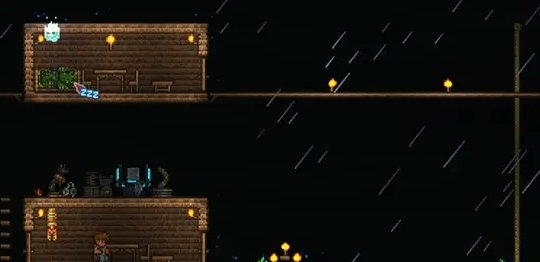 空中小屋搭好后,僵尸上不了平台,眼球怪破坏不了门口,就可以安全地在房间里等待天亮啦;