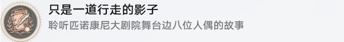 聆听匹诺康尼大剧院舞台边八位人偶的故事,匹诺康尼大剧院北部,在舞台周围有8个人偶,将8个人偶各调查一次后,再与任一人偶对话,即可解锁成就。