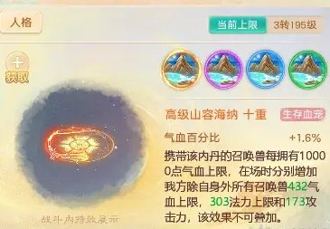 山容海纳:增加气血百分比,在场上是增加所有召唤兽气血,法力和攻击