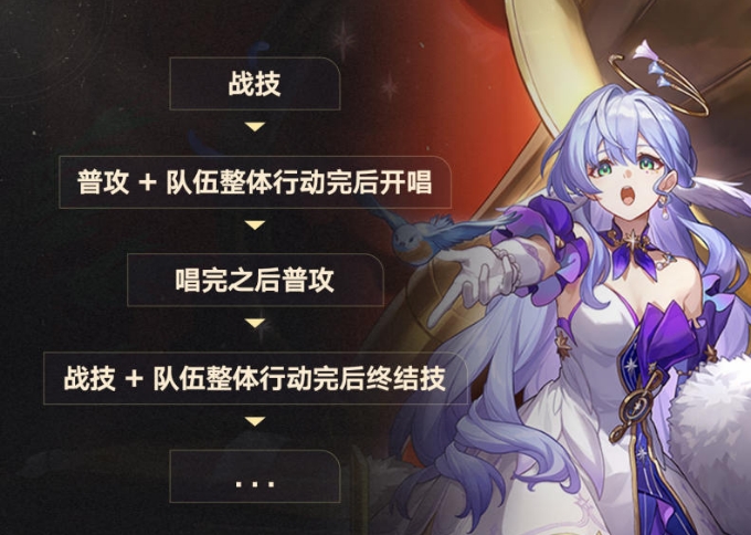 上述的速度要求,对一些带输出鞋的主C来说(尤其是回合外输出能力强的,比如姬子、银枝、黑塔等),有点太高了,那么此时也可以提前知更鸟第一次开大的时机,让主C最后一动挤在四回合结束前完成。这样一来,虽说主C同样是四回合总共六动,但是将有四次行动被知更鸟的歌声萦绕,获得更高的buff覆盖率,而且对于一些要更早开大的主C来说,也不用为了听歌将终结技捏到第三动了,而是可以在第二动时候顺势开大,不浪费能量。