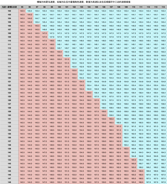图中,横轴为队伍中最慢角色的速度,纵轴为知更鸟速度,而表格中的数值对应了高速队友在后续循环中实现三动所需要的速度。红色的格子表明速度瓶颈是队中最慢的角色,而蓝色格子表明速度瓶颈是知更鸟。