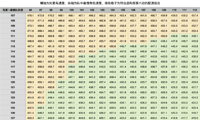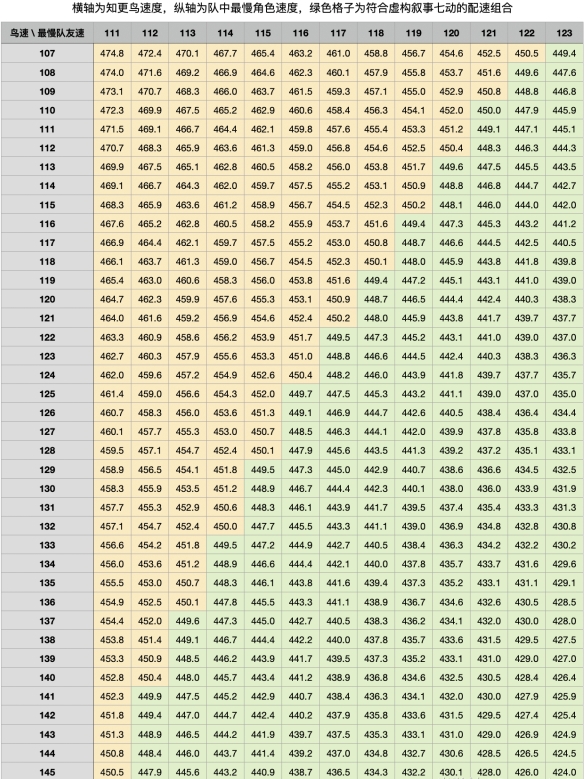 图中,横轴为队伍中最慢角色的速度,纵轴为知更鸟速度,表中的数值对应了队伍中最慢角色行动七次所需要的总行动值,绿色格子为符合慢速角色虚构叙事七动的配速组合。例如,知更鸟速度为120,在表中从左往右查,第一个绿色格子对应的横轴坐标是118,那么就说明你队中最慢的角色需要速度达到118,才能实现全队虚构叙事至少七动。