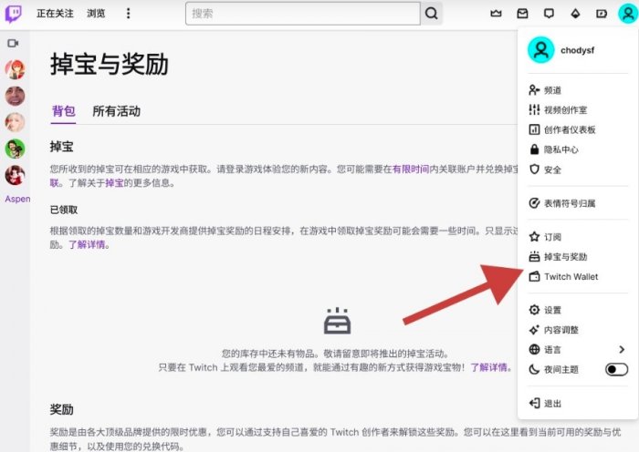 首先你需要个能加速twitch网站的加速器(大部分主流加速器都有),然后进入网站,没有账号的先注册一个账号(很简单),登录成功之后点击你的账户会有个掉宝与奖励,点进去就会看见活动。