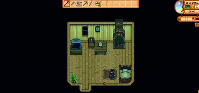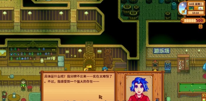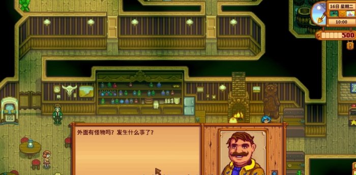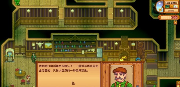 第二天起床,室内好像出现了一层绿色的滤镜,左下角会提示星露谷下起了绿色的雨。