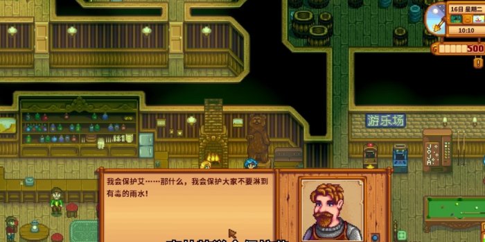 绿雨天气在我看来新鲜中夹杂着一丝普通,这一天植物的生命力会更加旺盛一些,除此之外酒吧里村民的对话也挺有意思的。