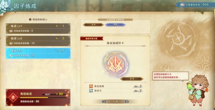 一共有3个等级的炼成,跟随主线进度开启;炼成Lv1每次需要5张抽奖券,炼成Lv2每次需要10张抽奖券,炼成Lv3每次需要25张抽奖券。