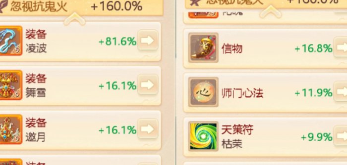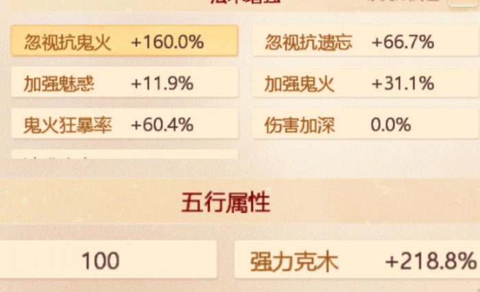 这是我们秒250万女鬼的忽视和强力克属性。忽视鬼火160,强力克木218.8,另外还有鬼火狂暴率60%。
