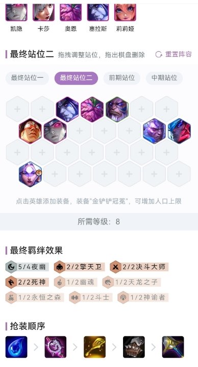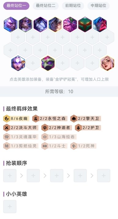 下面分别是8-10级的阵容图,1-7级就不说了,记住一句话就是只留夜幽牌就行,夜幽+石头人琪亚那随便混到7级,哪怕连败都无所谓