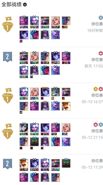 4.对棋子要求很低:前面说了,这个阵容几乎所有4-5费卡都可以塞进去用,来什么用什么。第二是不吃棋子的星级,不用追3星,2星就很强,甚至1星也无所谓,不信你看我的战绩图,很多时候我的主力5费卡瑟提刀妹沙皇到最后都是1星,丝毫不影响我吃鸡。