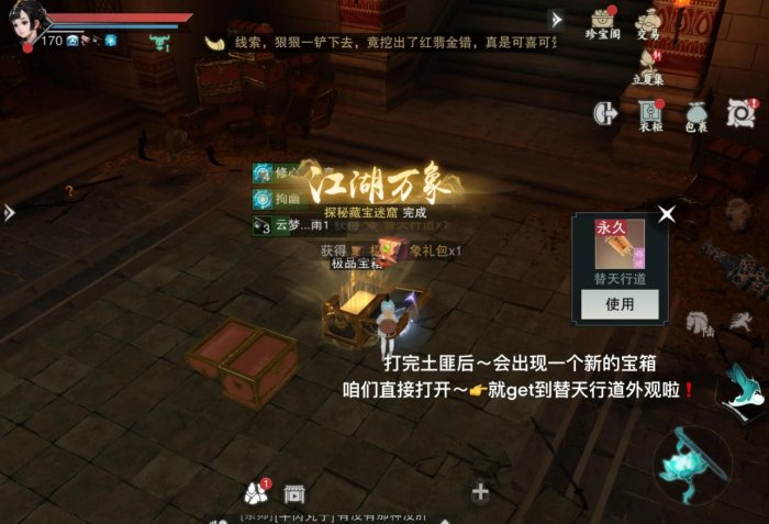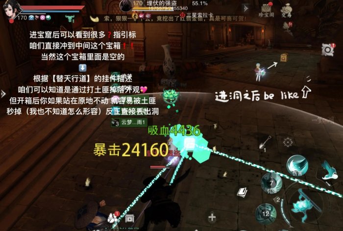 二、进洞后,咱们会看到很多带问号的指引,不必理会哈哈哈哈,直接冲到中间的宝箱!!点击开启后,会跳出来一波土匪!
