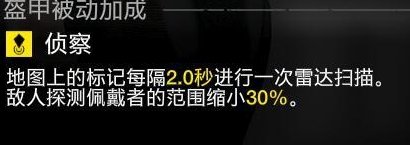 4、侦察甲:2s扫描一次,敌人发现你的范围-30%,是一个上限很高下限极低的护甲,在大佬手中在敌人眼皮子底下不惊动敌人把任务做了然后全身而退,不会用的穿上等于白板,萌新不推荐使用。