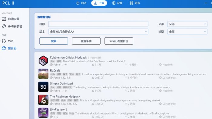 国内的主流启动器都带curseforge的整合包下载功能,可以在里面寻找下载量高,更新时间新的整合包,一般这些质量不会低。