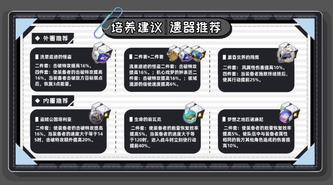 外圈次推二件套+二件套;目前除怪诞套外,没有其他特别契合的四件套,因此也可选择更好毕业的二+二;二怪盗、二机心、二信使随意散搭,伤害差距都不大,选择击破、速度词条更多的即可;
