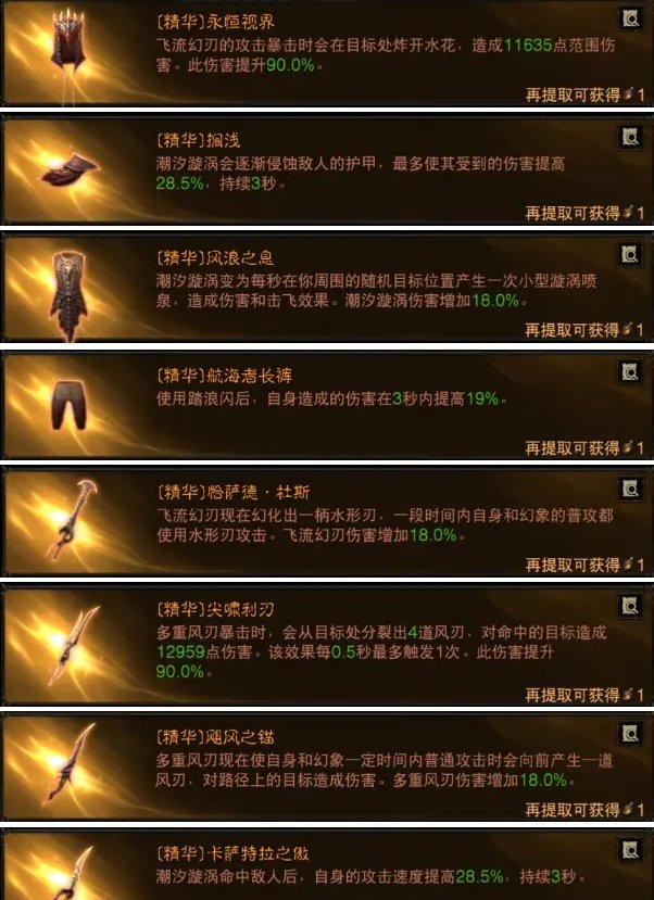 水刀流玩法搭配了多数的水系技能,其中核心是飞流幻刃水型刃也叫“水刀”,同时混合了多重风刃、潮汐漩涡、踏浪闪这3个技能,把极致的水刀挥砍完美呈现!其中潮汐漩涡可以给我们提供攻速和增伤,多重风刃搭配普攻打出AOE和更强的爆发。我们可以在冲浪的基础上持续砍出水刀,是目前小幽觉得最完美的水系刺客玩法!
