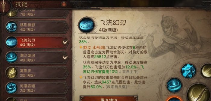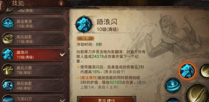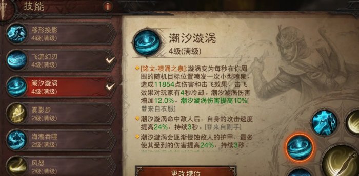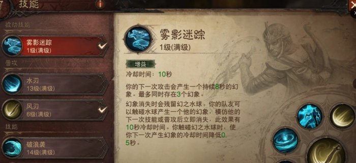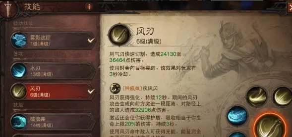普攻选择风刃而不是水刃,因为风刃带有目标突进的效果,这个效果可以让我们连续突进刷怪,你会感觉打击感很强,同时比水刃方便。