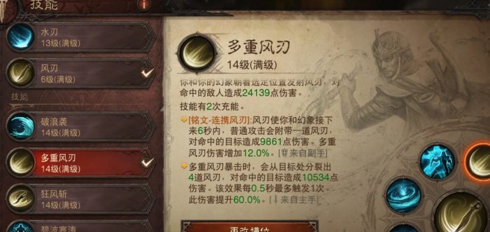 多重风刃可以使普攻砍出风刃类似幽暗之瞳可以打出的远程输出,同时多重风刃在暴击时可以打出4道风刃,对目标造成伤害,该效果0.5秒触发一次。