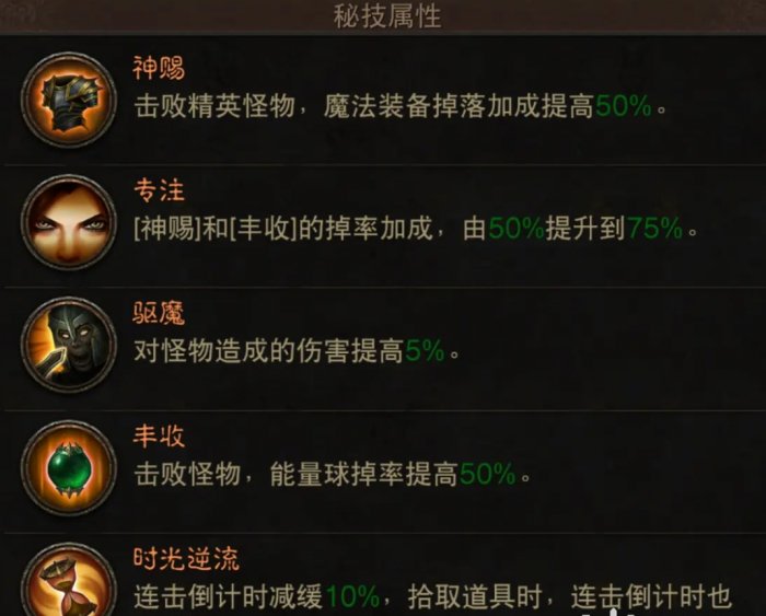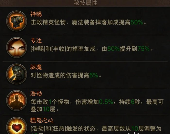 3、最后一个秘技一般用驱魔。但要注意,驱魔的5%增伤对召唤物无效,死灵这种召唤类职业也可以改用丰收,多掉几个战斗球。