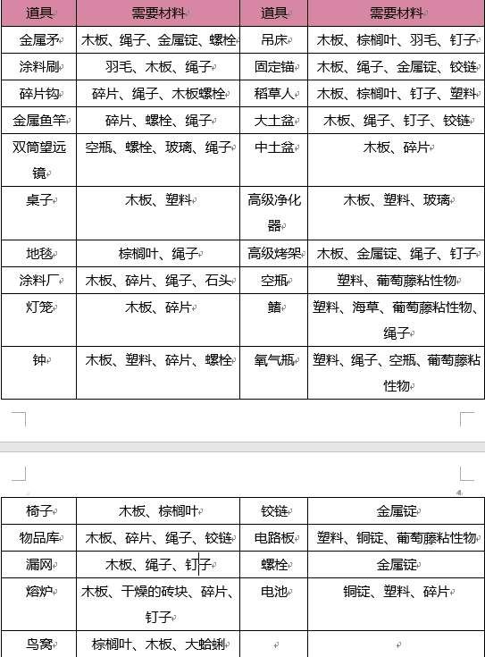塑料:塑料是建造木筏和制作许多工具的重要材料。漂浮在海面上的塑料瓶和碎片可以用钩子收集。