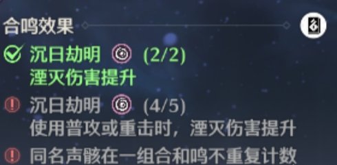 如下图所示,套装即为图中的合鸣效果,如果装备的主声骸和副声骸属于沉日劫明数量达到2个,即可提升湮灭伤害,如果达到5个,则可通过普攻和重击来获得湮灭伤害加成。