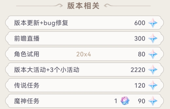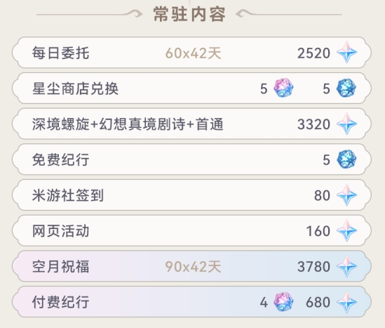 原石总数如下(白嫖党65抽,小月卡党89抽,大月卡党97抽)