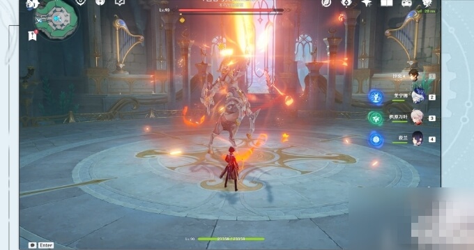 与魔像督军进行战斗,首先使用队伍中的岩系/大剑角色将其护盾压低至较低水平。
