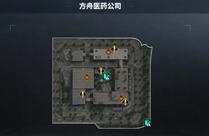方舟医药公司主要由三部分组成,分别是北侧的1号区域C栋和D栋、西南侧的2号区域B座、东南侧的3号区域A座。全场共有2个撤离点、4个火金刷新点、3个高价值资源点和2个自动售卖机,危险等级较高,物资充足,收益等级较高。