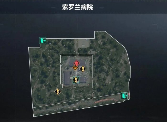 从地图上可以看到,本地图较为宽阔,室外区域较多但物资极少,大部分物资都在地图中央的紫罗兰病院1、2、3号楼,怎么区分?从病院南门进入,正对面(北面)是一号楼,左侧(西侧)是二号楼,右侧(东侧)是三号楼。