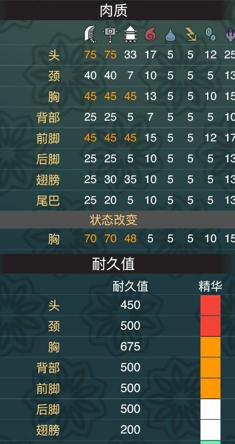 对于近战武器:头部肉质75,胸和前脚是45,脖子是40,其它部位过低,不详细说明。比较特殊的是三阶段后胸部肉质提升至70。由于黑龙要求我们破头的机制,尽量多对头部输出,每次破头三阶段伤害都会有些降低,否则三阶段为蓝火状态,伤害极高。对于远程武器:头部、胸部肉质分别为33和45,三阶段胸部肉质提升到48,另外远程武器对黑龙头部造成伤害无法吃到弱点特效的会心加成,故主要打胸,远程武器打黑龙又称为蓝火黑龙房,极易暴毙,远程武器玩家要有个心理准备。