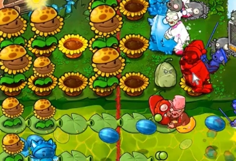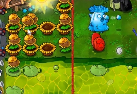 3.然后在左侧种植补充一列阳光向日葵,在水池中种植多个豌豆荷叶和寒冰西瓜猫蒲。