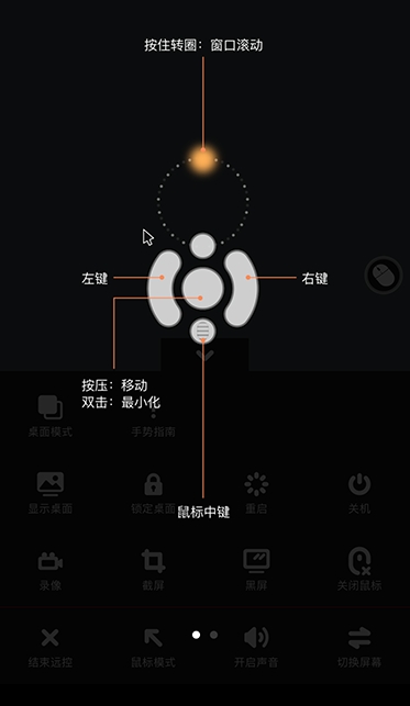 如手机控制电脑浏览页面,可按住上方圆圈按住转圈,实现窗口滚动。