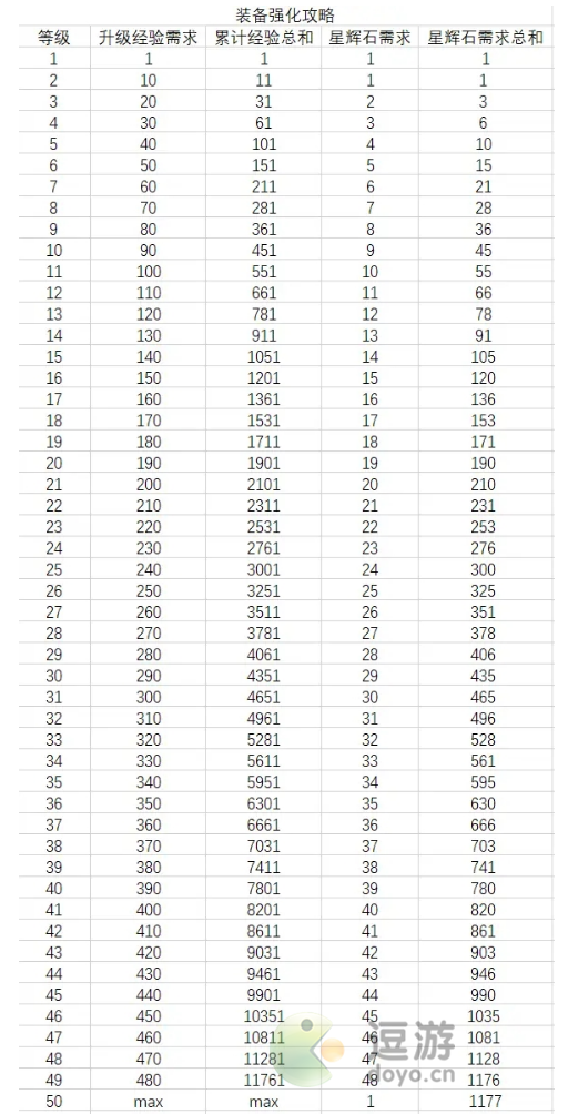 3、因为装备1级升2级需要1点经验值,而且强化bug会出现2级经验值10/10的情况,所以最后50级总体上是需要额外1点的,等级1的位置没有算在求和里而是放在50级那个位置