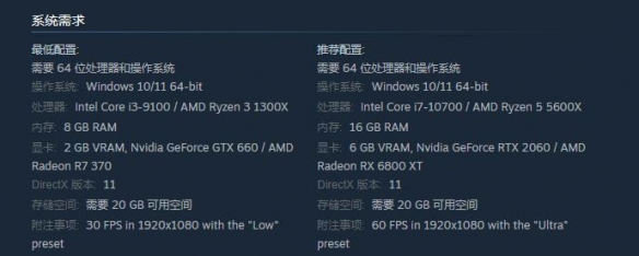 显卡: 6 GB VRAM, Nvidia GeForce RTX 2060 / AMD Radeon RX 6800 XT