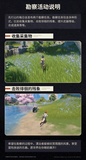 在活动期间,玩家每天可以完成两个勘察任务,任务类型多样,包括收集采集物、击败徘徊的残象、提升武器等级、合成道具等。完成这些任务后,玩家将获得相应的勘察点数。