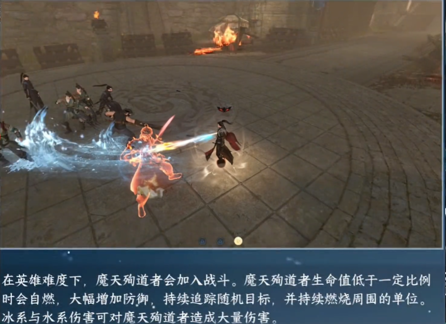 在英雄难度下,魔天殉道者会加入战斗。魔天殉道者生命值低于一定比例时会自燃,大幅增加防御,持续追踪随机目标,并持续燃烧周围的单位。冰系与水系伤害可对魔天殉道者造成大量伤害。