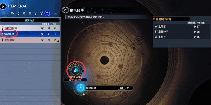 制作等级达到6级,才能制作捕鸟陷阱。需要用到三个,所以做三个捕鸟陷阱。